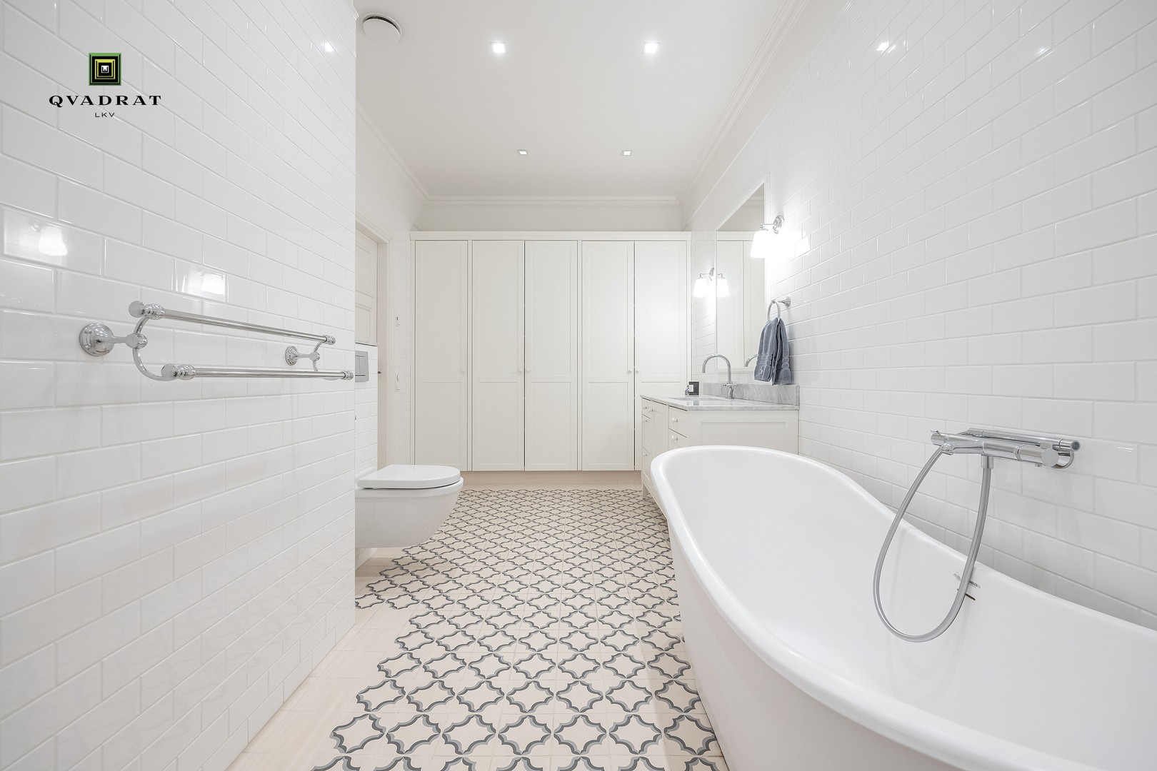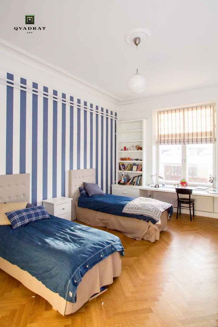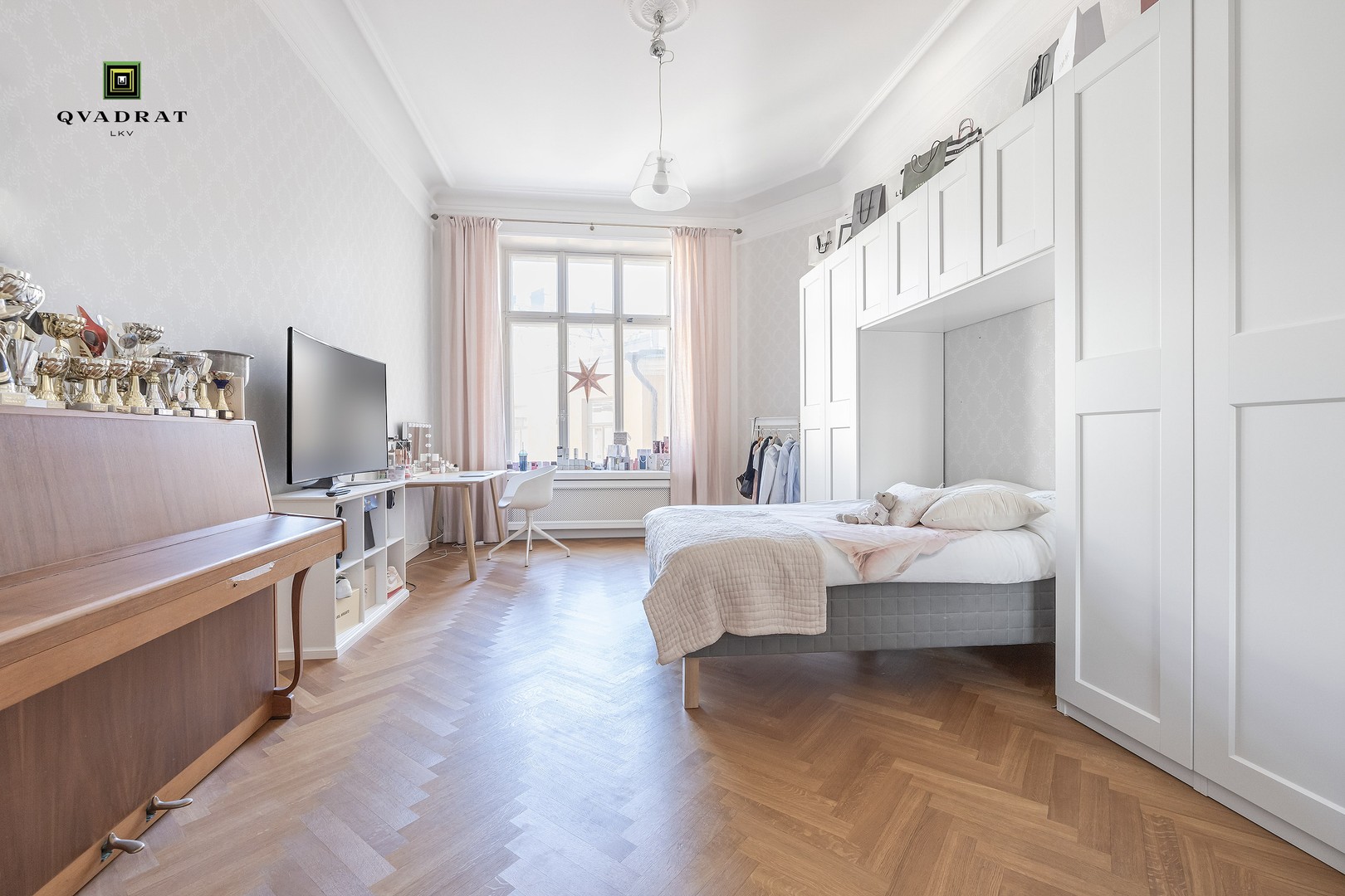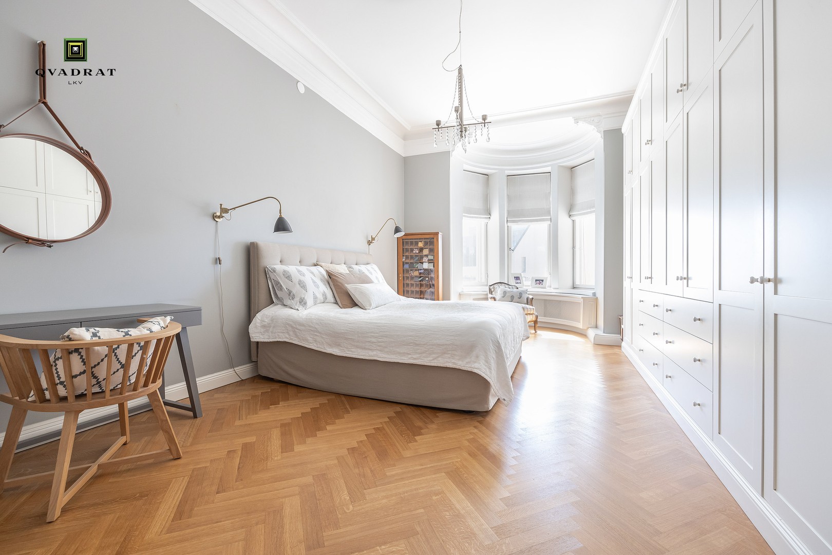 Asunnon kolme isot makuuhuoneet tarjoavat rauhalliset ja viihtyisät puitteet levolle, kun taas kaksi kaunista kylpyhuonetta sekä erillinen kodihoitotila lisäävät asumismukavuutta. Korkeat huoneet ja suuret ikkunat tuovat runsaasti valoa ja avaruutta, luoden ylellisen ja kutsuvan ilmapiirin.