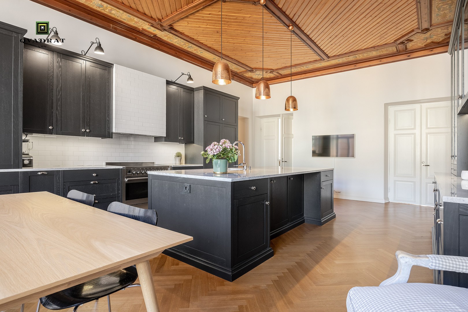 Tässä 204 neliömetrin kodissa on onnistuneesti yhdistetty historiallinen charmikkuus ja moderni mukavuus. Tilavassa ja hyvin varustellussa keittiössä on laadukkaat kodinkoneet sekä suuri saareke, joka tekee siitä jokaisen kotikokin unelman. Keittiö ja olohuone yhdistyvät luontevasti, tarjoten täydellisen tilan niin arjen kuin juhlienkin viettoon.