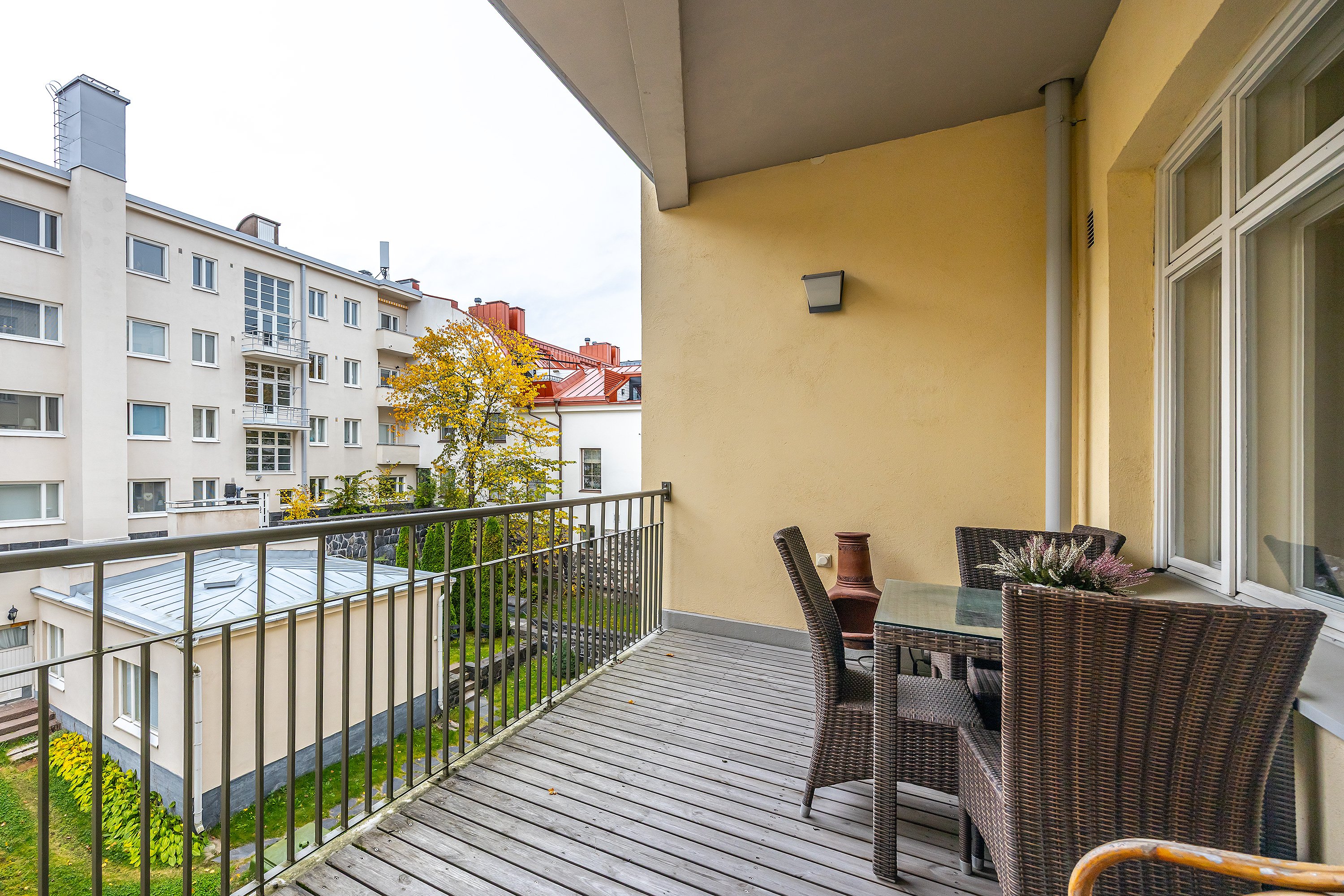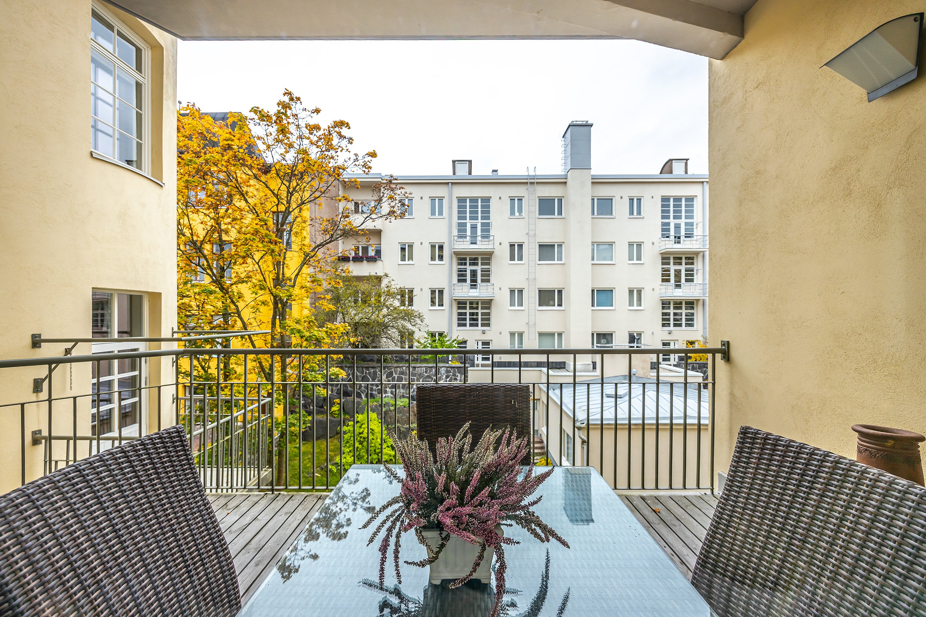 Valoa tulvii sisään suurista ikkunoista, ja parvekkeelta avautuva kauniit sisäpihan maisemat.
