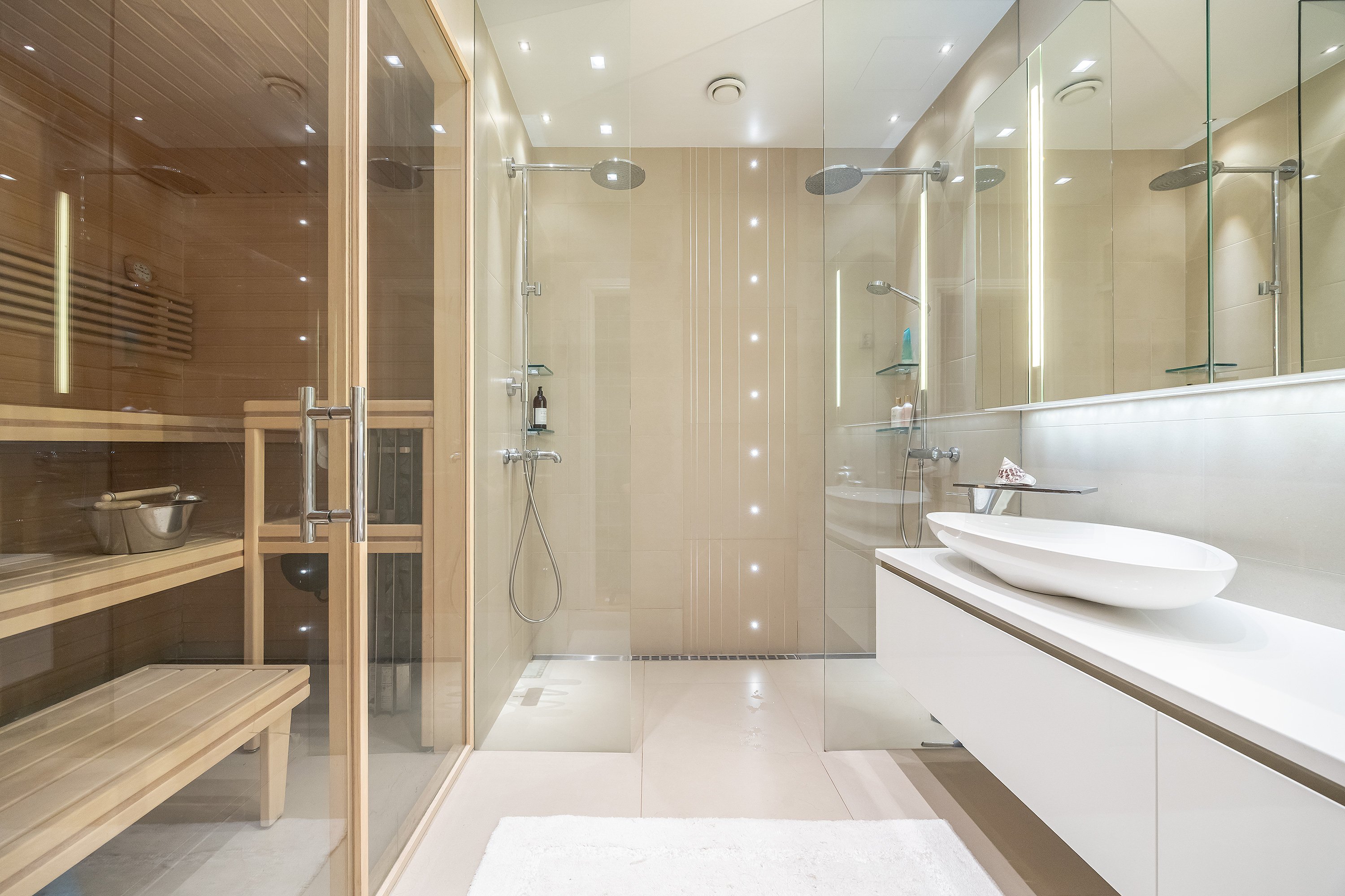 Ylellinen Master Bedroom -sviitti: Päämakuuhuone on oma rauhan tyyssijansa, johon kuuluu oma, tyylikäs kylpyhuone sekä rentouttava sauna.
