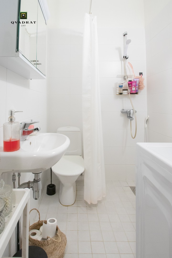 WC-istuin, suihku, pesuallas, peilikaappi, pesukone ja pesukoneliitäntä